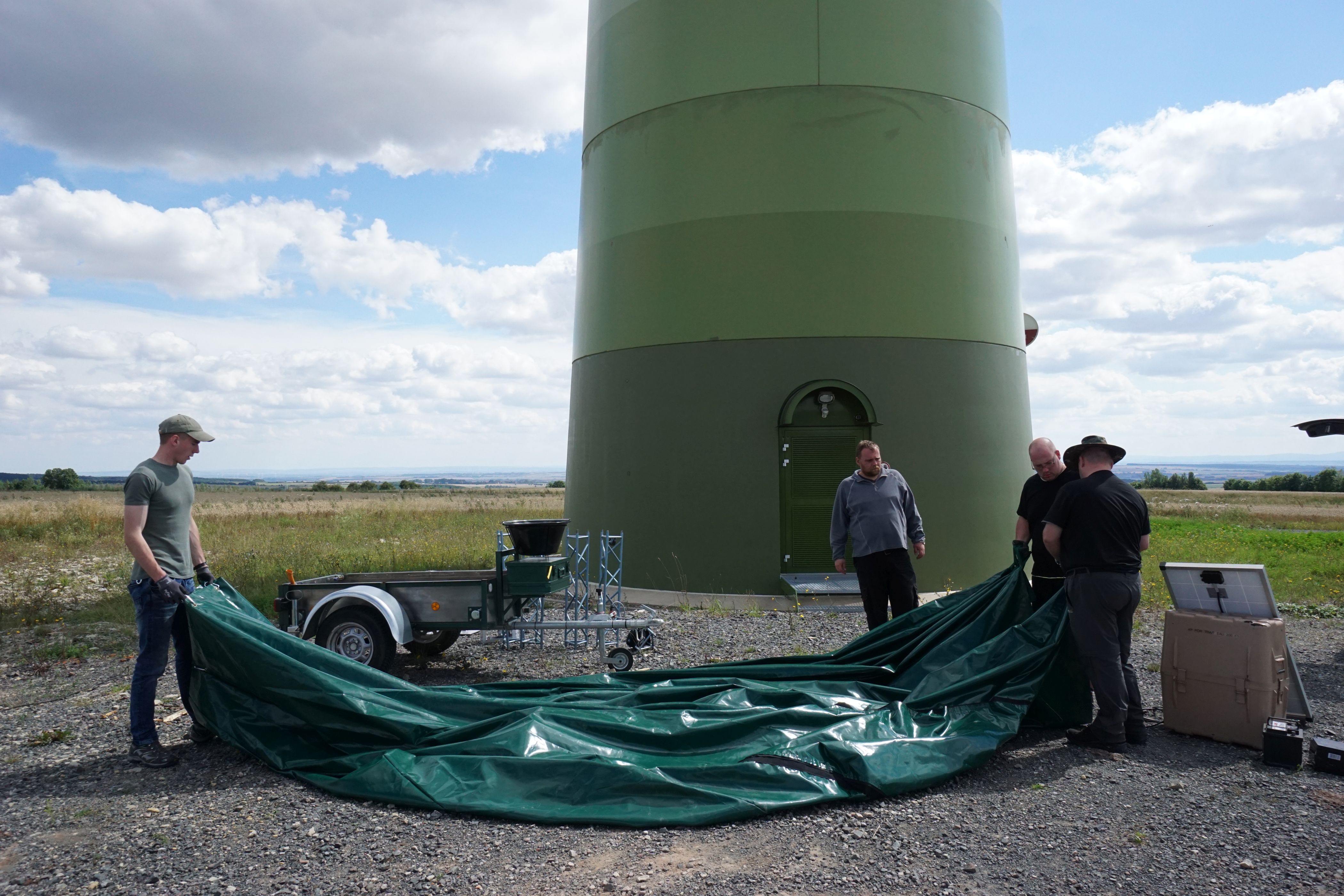 DO4VEB befindet sich im grünen Indianerzelt und zieht mit einer Winde die Zelthaut an einem Schlitten auf seine vollständig