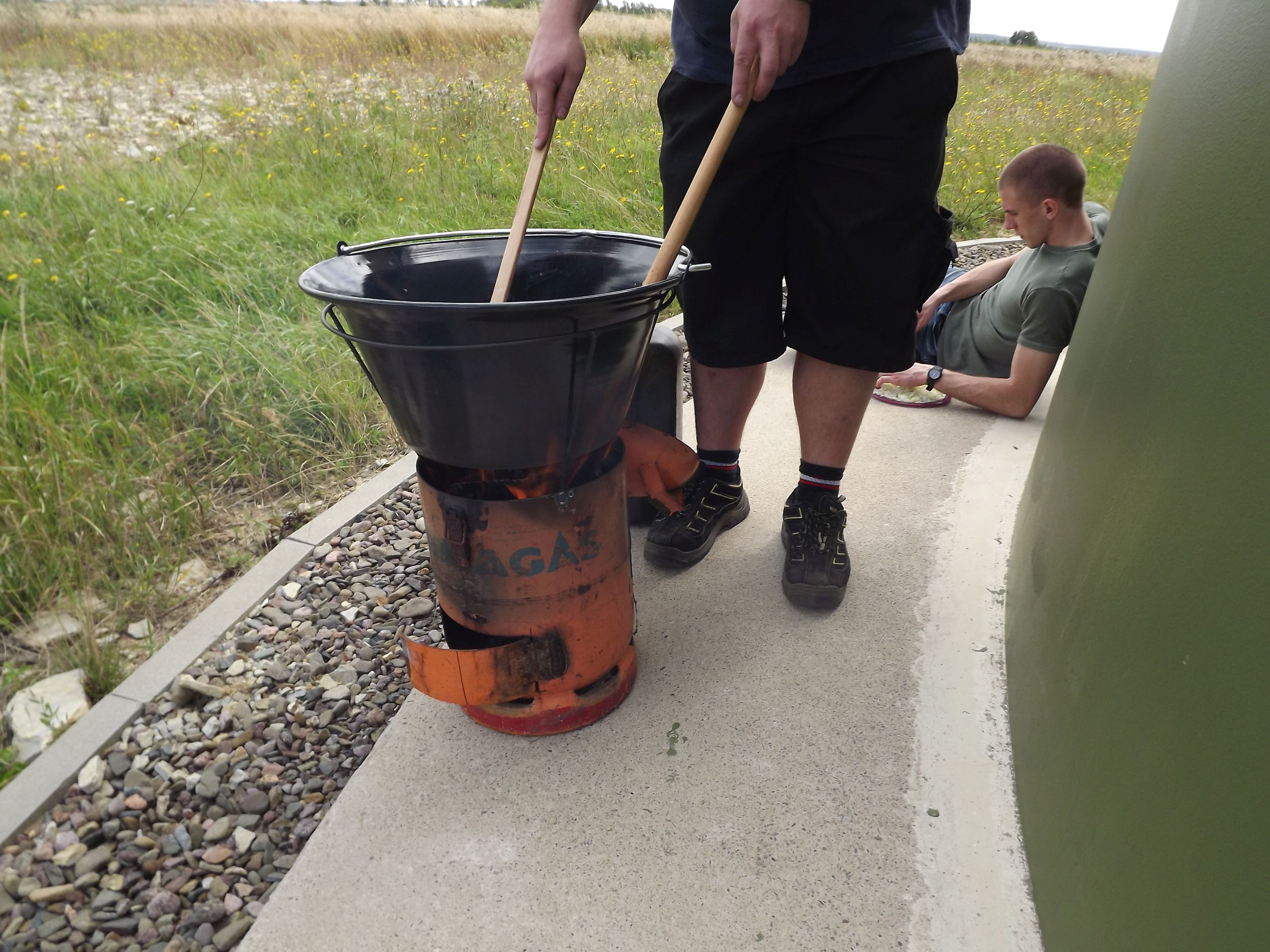 einen riesigen Email-Topf sehr solide zu halten und zu erwärmen. Am Szepter: DO4VEB; im Hintergrund zwiebelt SWL Karsten.