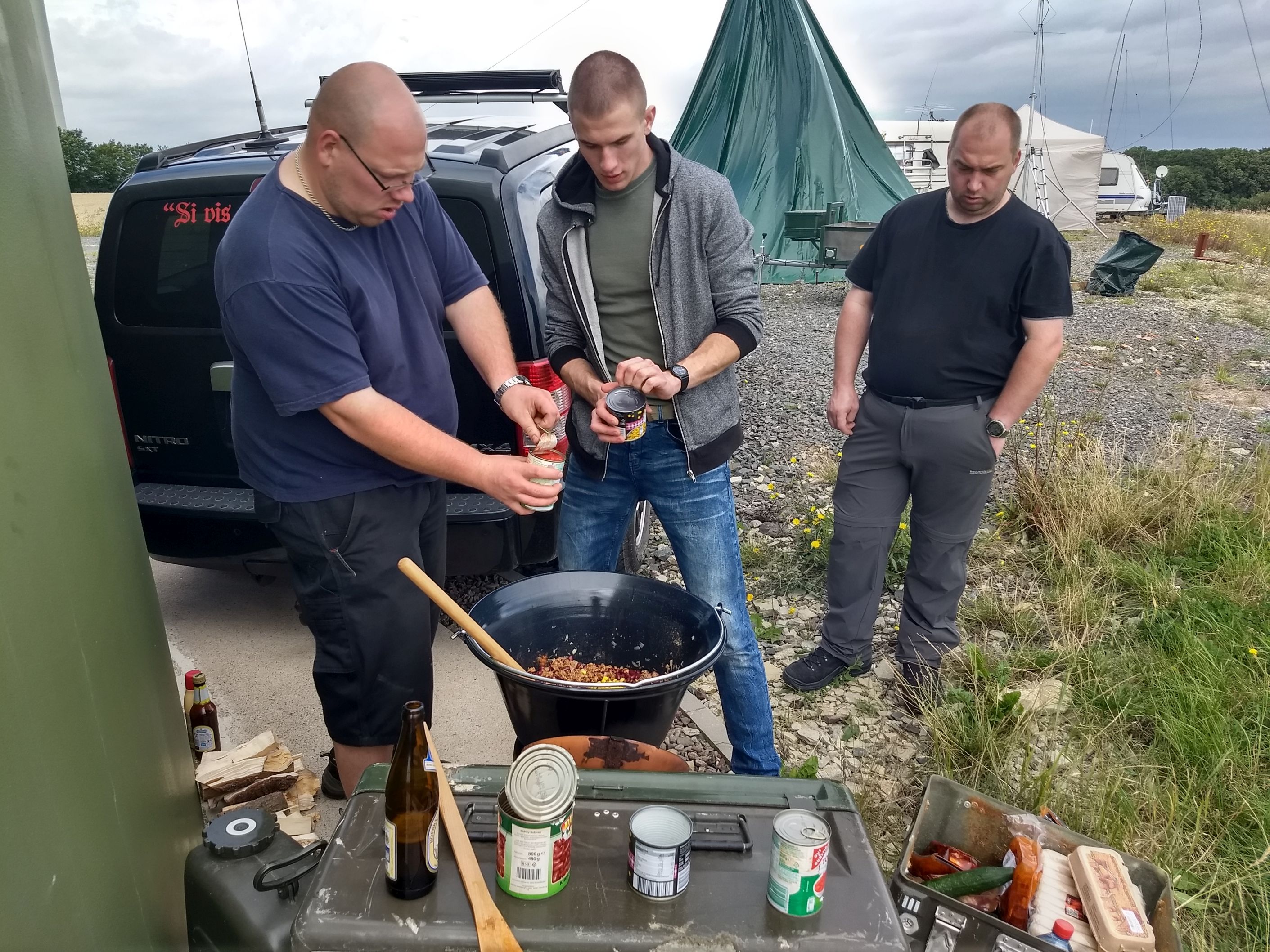DO4VEB (links) und SWL Karsten bringen weitere Zutaten zum Chili, DL5ASG (rechts) passt auf, dass das auch klappt.
