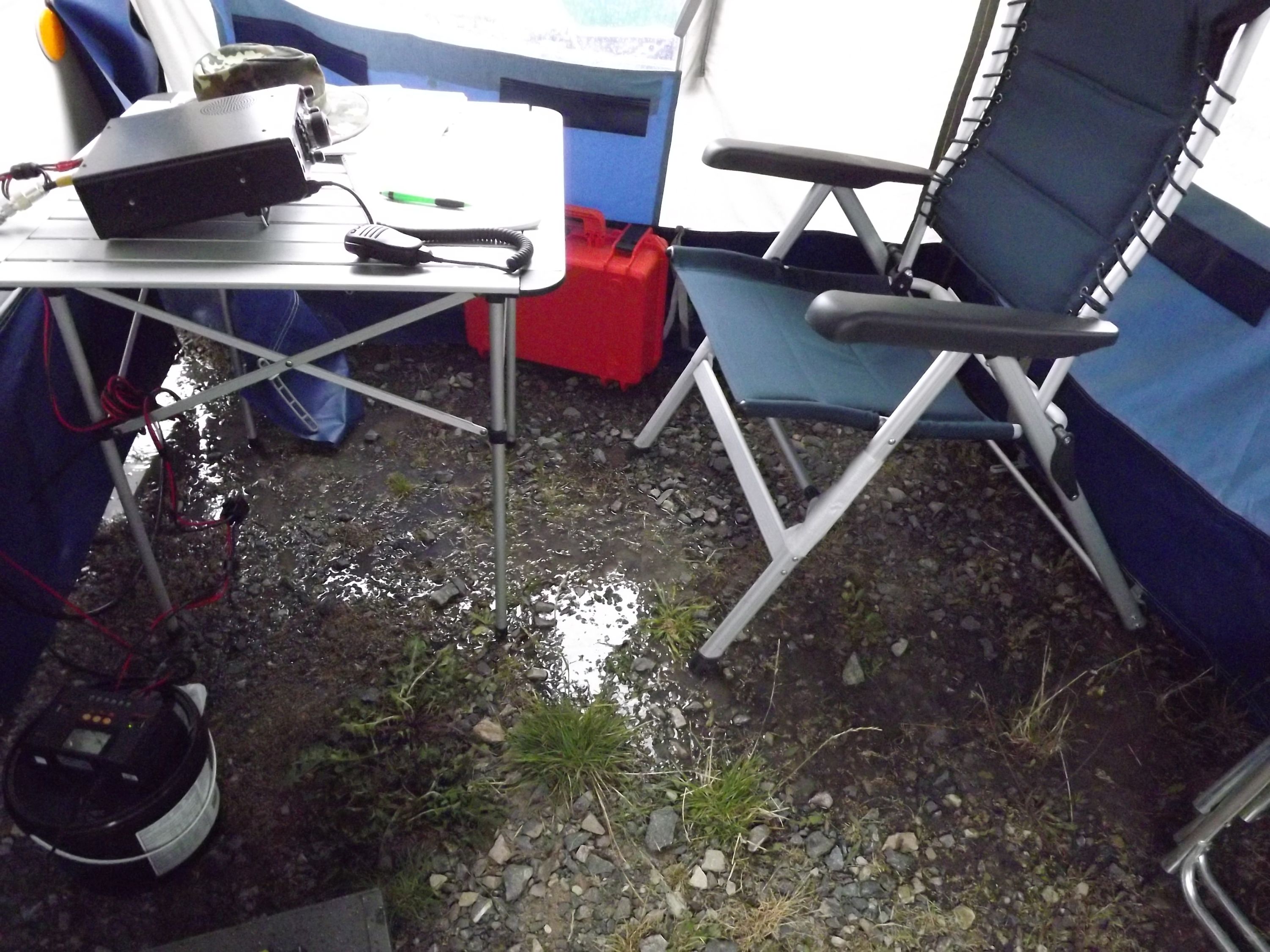 Bis zum FT991 war allerdings noch viel Platz und so wurden nur die Schuhe nass. DL5ASGs Vorzelt, in dem das Bild