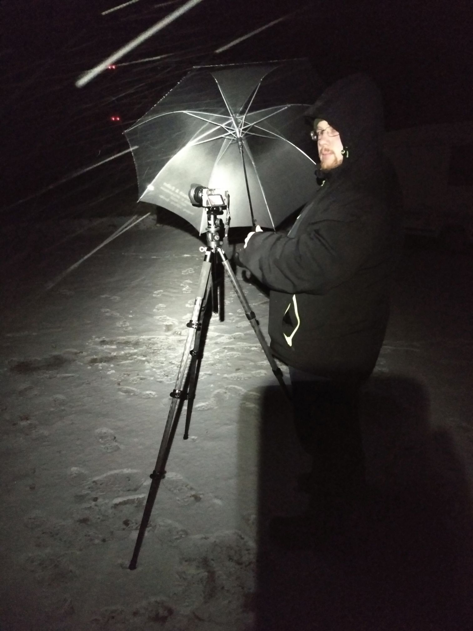 schützte für einige Fotoexperimente die Kamera mit dem Regenschirm vor