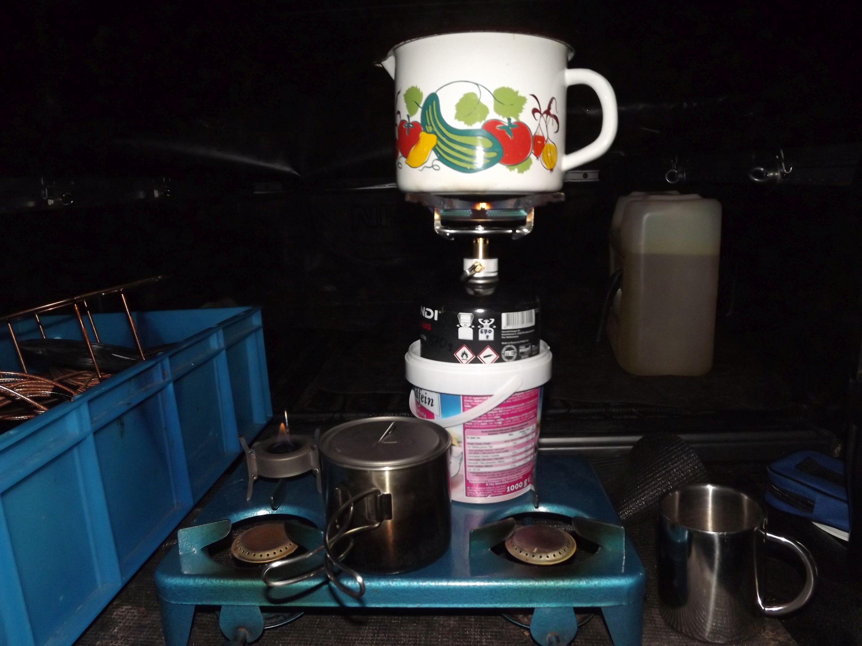 Benzinkocher zum Leben erweckt und zum Zwecke der Glühweinerwärmung auf die Ladefläche gestellt.
