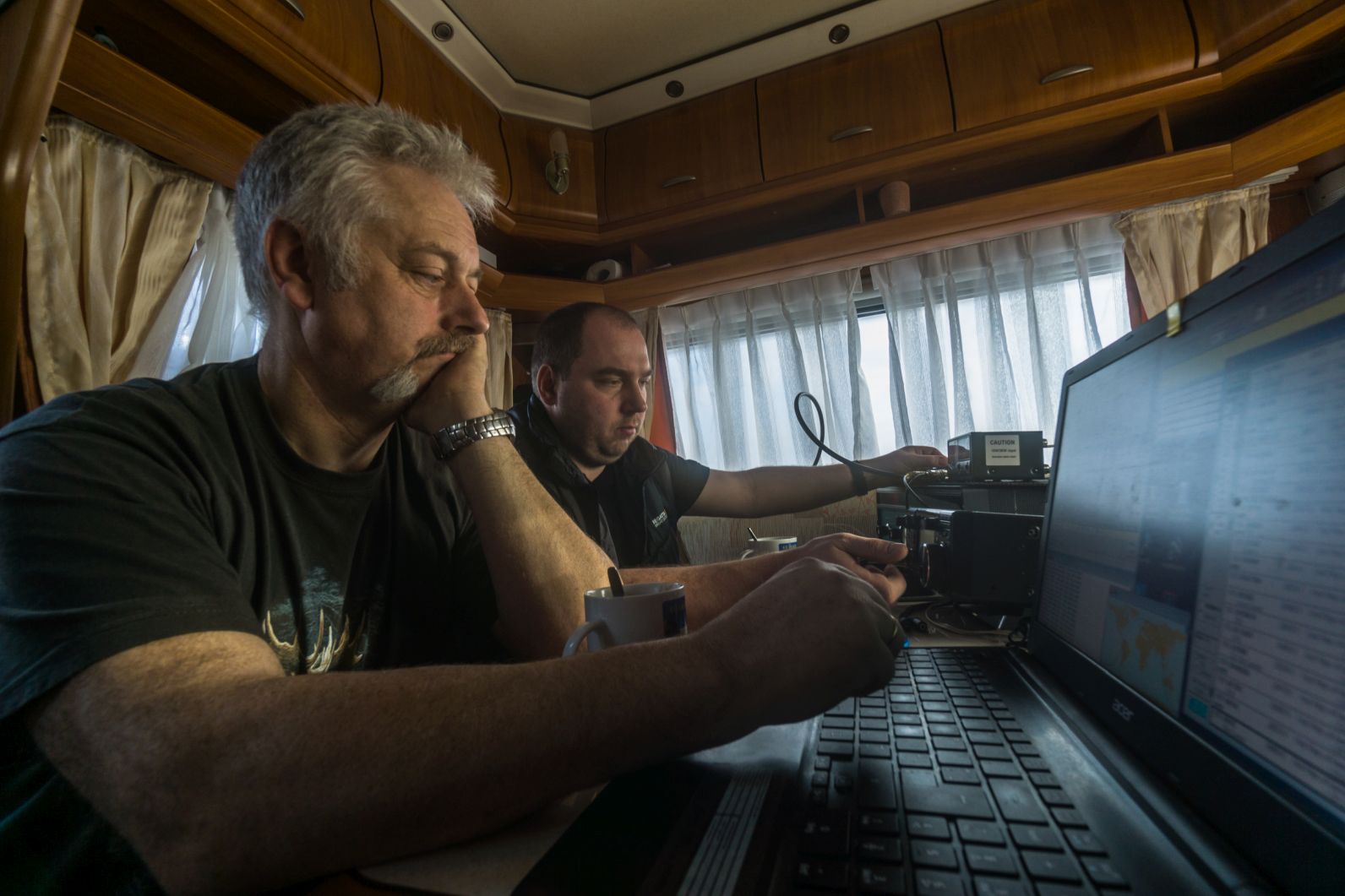 DL5ASG (hinten) und DL5ZK dabei fest, wie sie auf QSO-Suche über die Kurzwelle schlenderten.