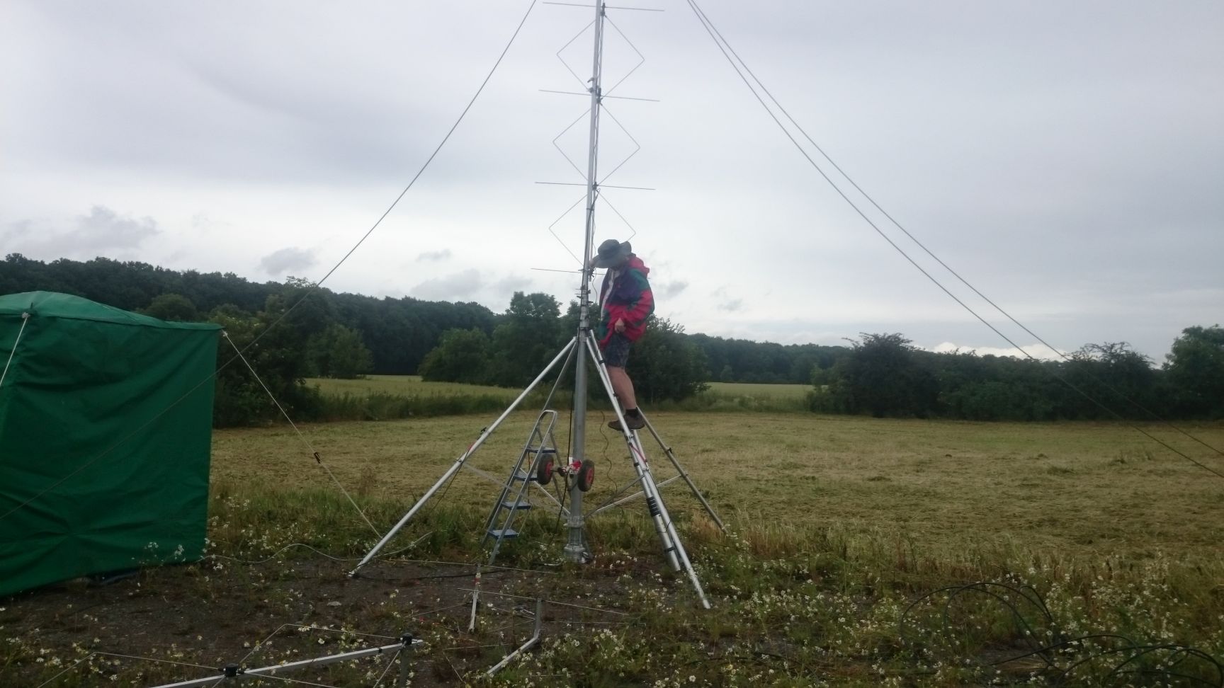 DO5AMF baute in regenfester Bekleidung die 2m Antennen an den Mast