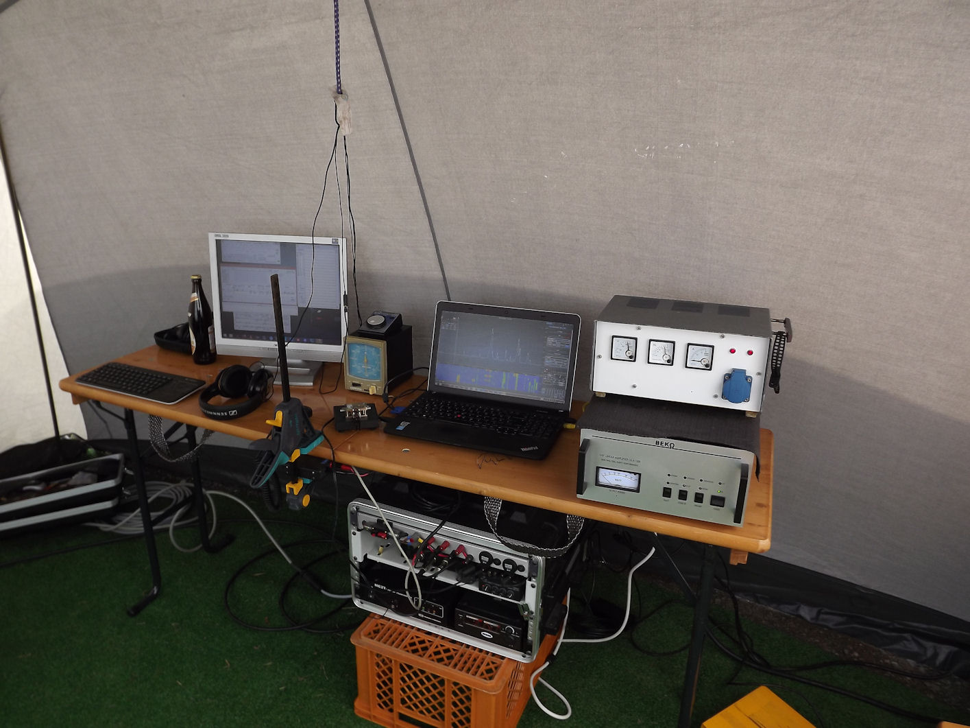 Der Stationsaufbau vom März auf der Bierbank und mit einem gemeinsamen Rechner für Logging und SDR-Software