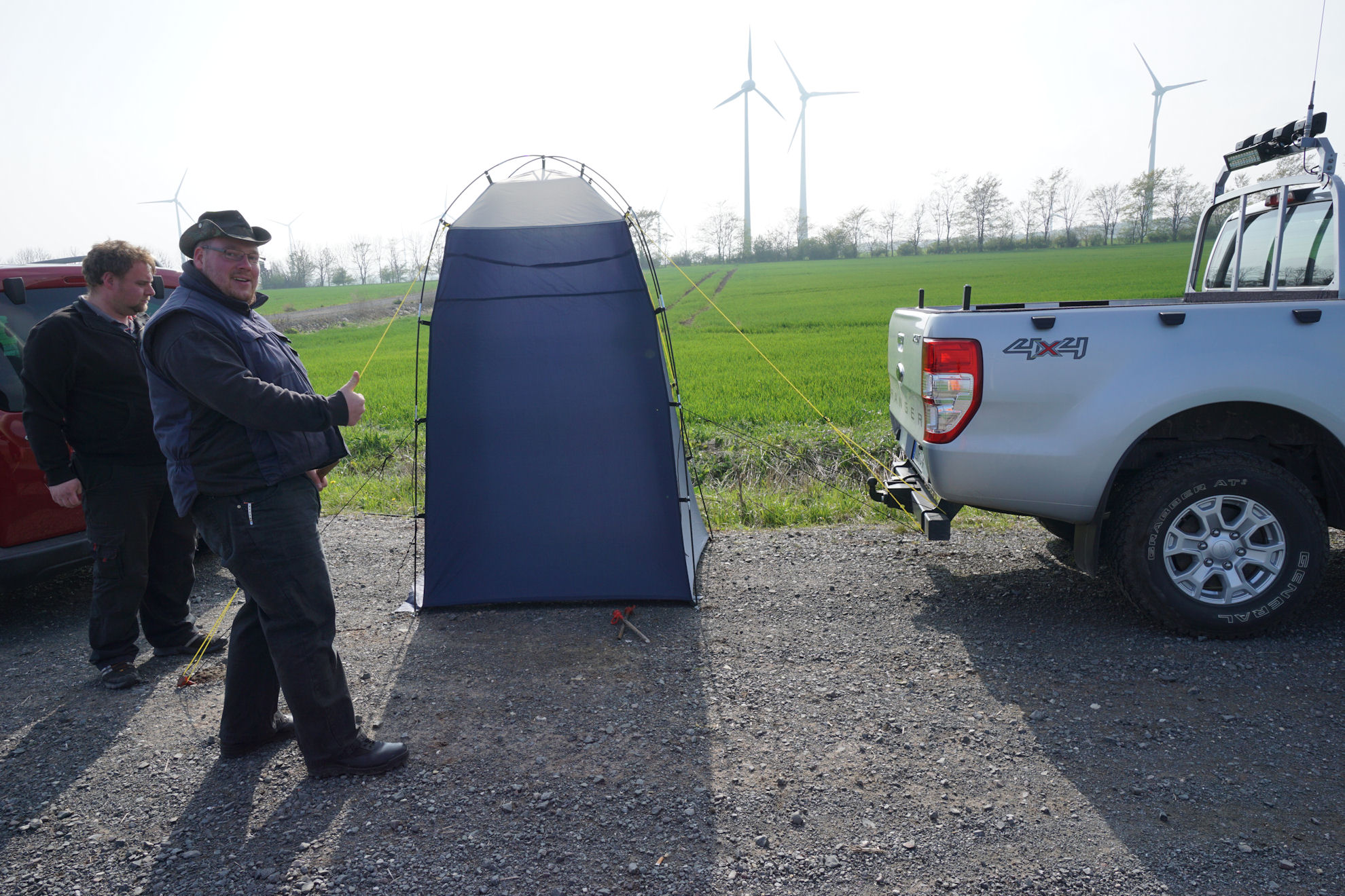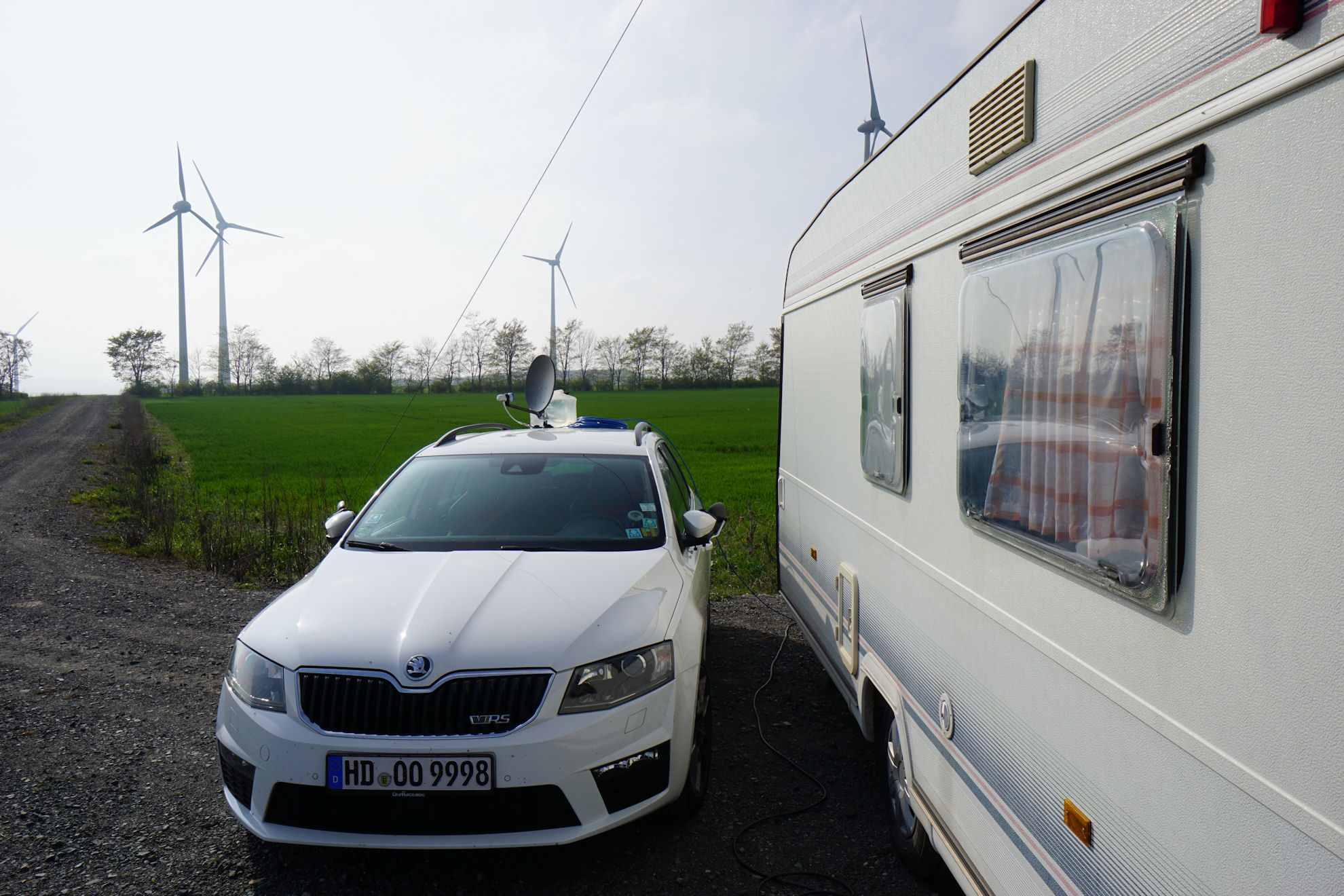 dass in Windrichtung kein Wohnwagen stand. Mit einigen Kraftfahrzeugen wurde der Wind dann abgeschottet.