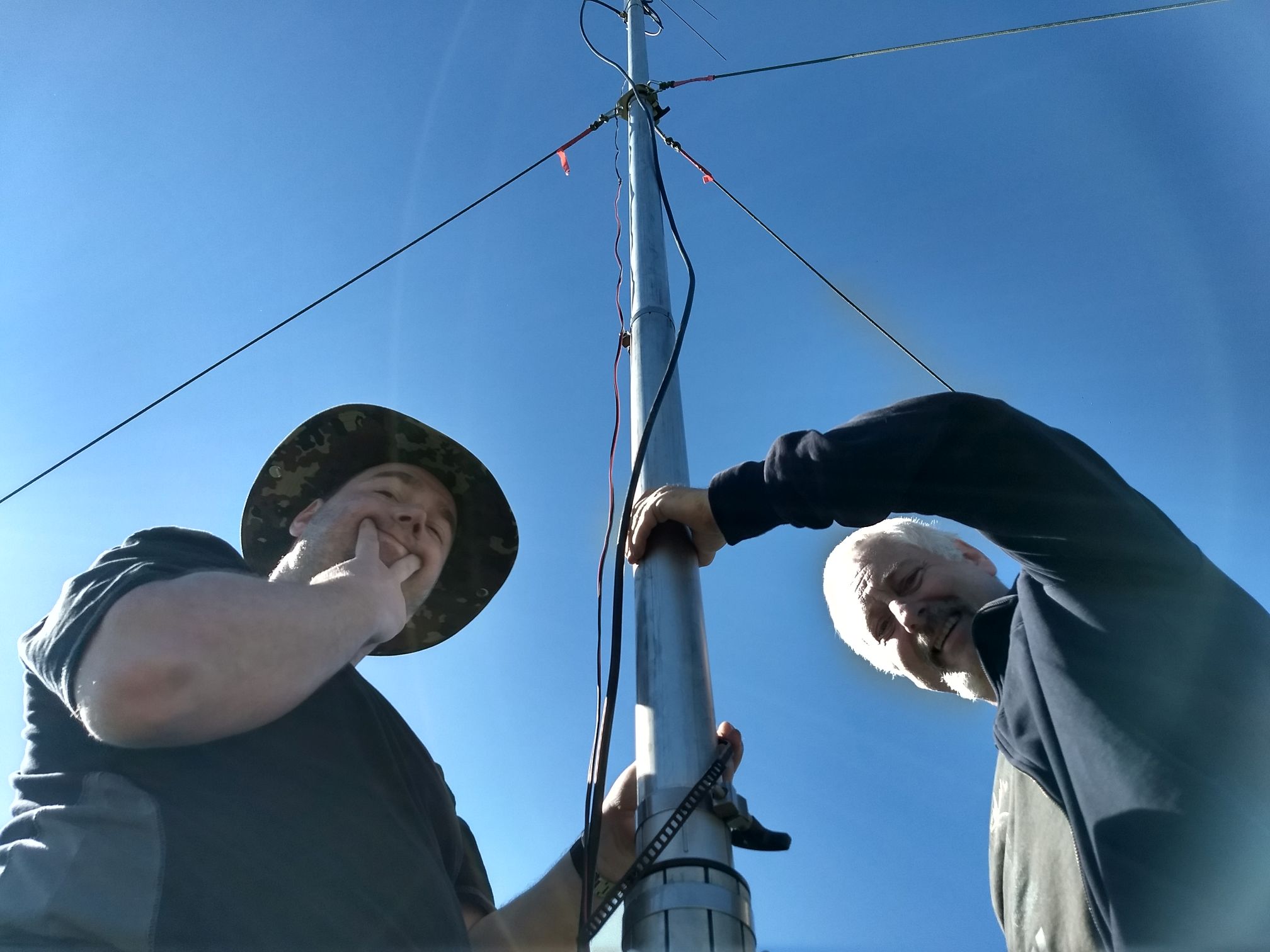 Der Antennenmast wurde souverän errichtet und beide OMs am Mast rangen