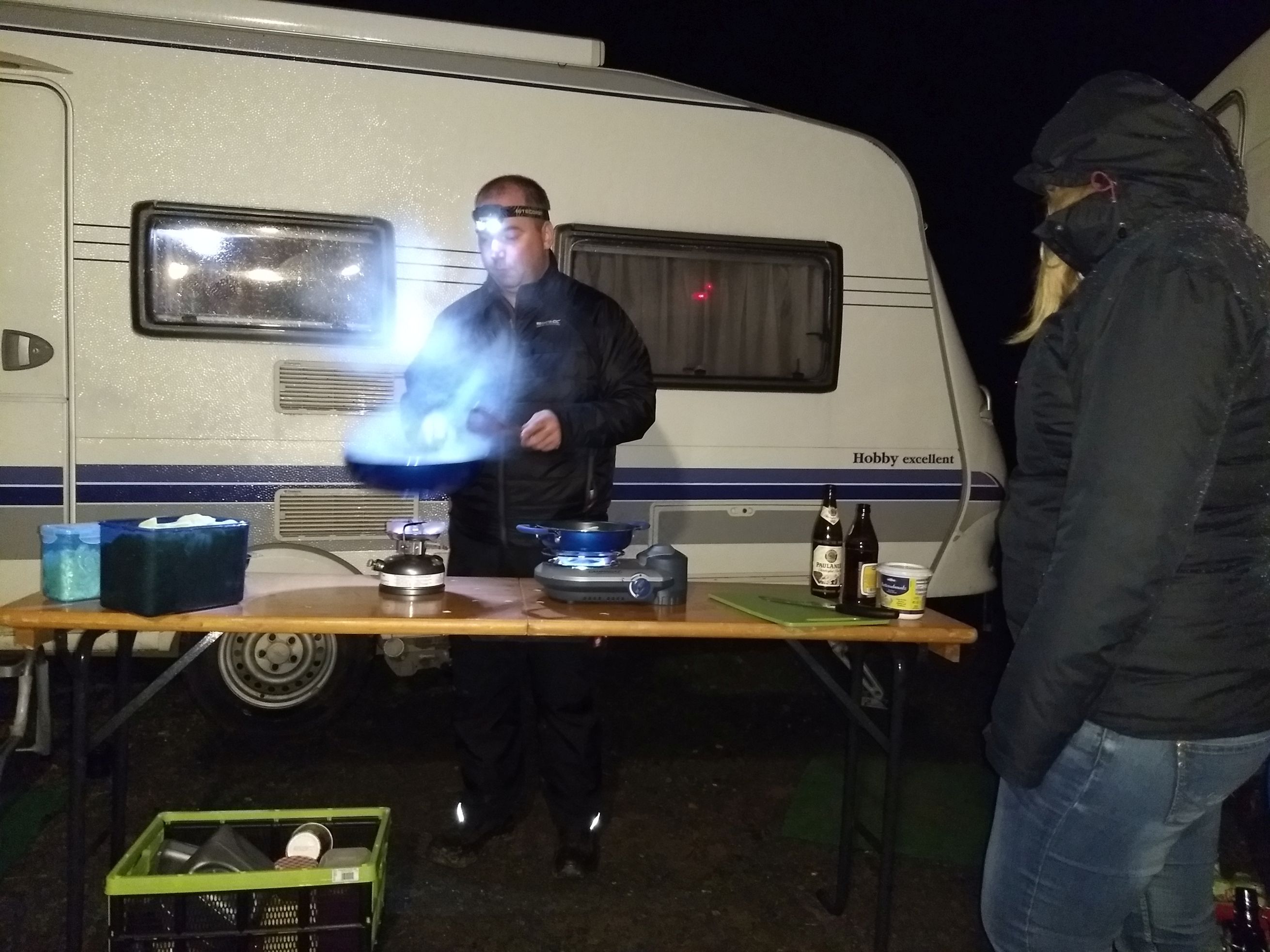 eher kochenden Tätigkeiten. Ein wahres Arsenal an Kochern bevölkerte das Wohnwagen-Vorzelt von DO7YLM und DO5AMF.