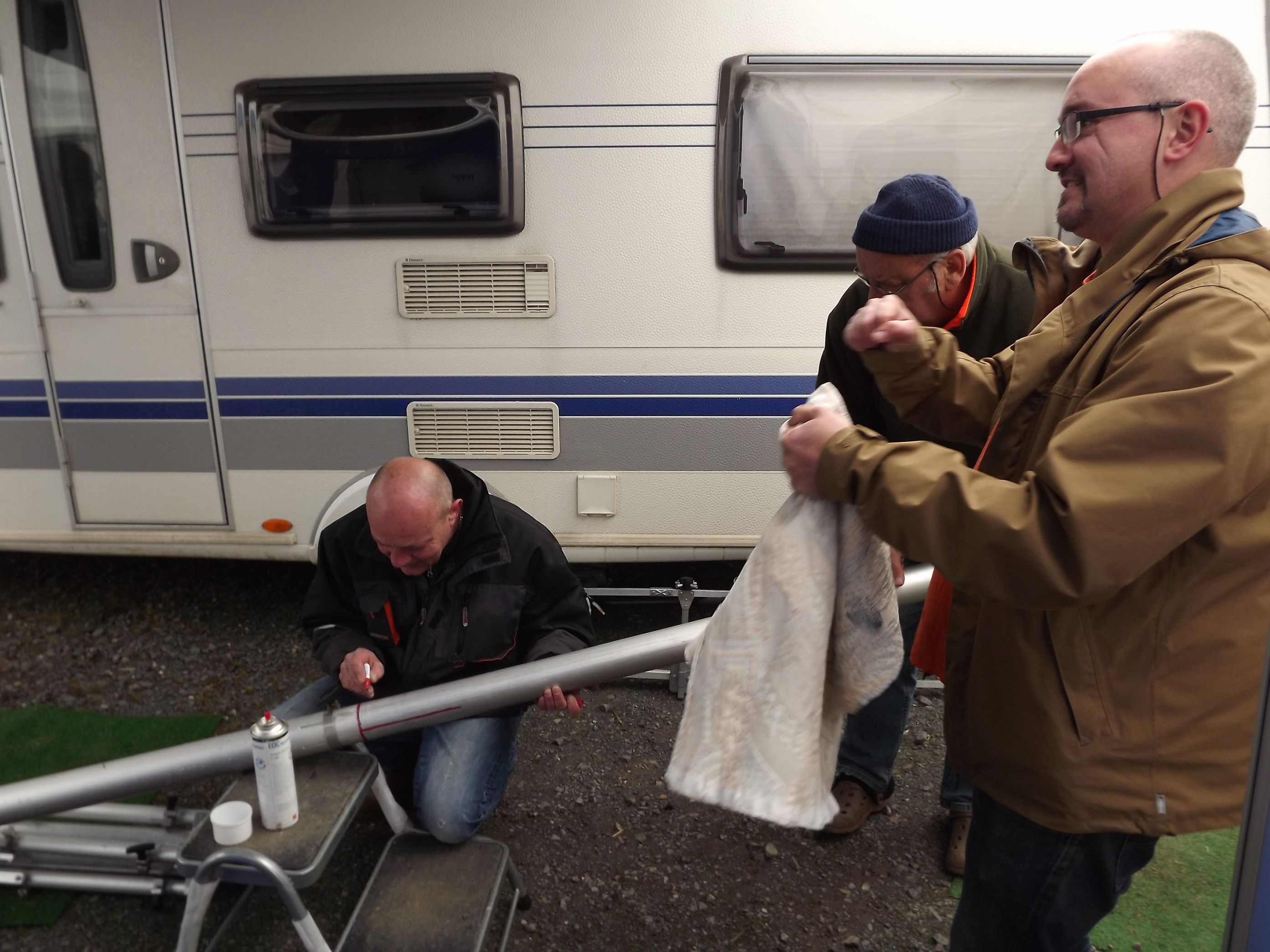 wieder zum Glänzen gebracht. DG0OVS zeichnet akribisch die Markierungen, DL5ZA hält ihm die Stange.