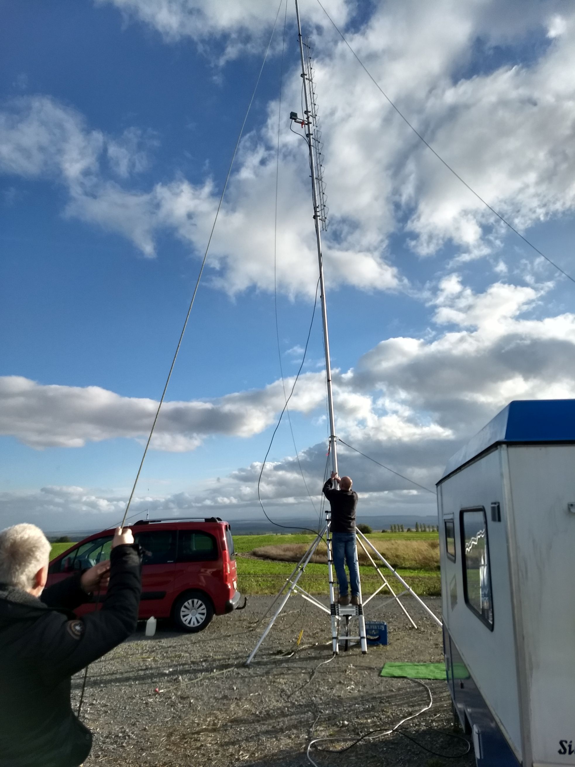 Der Mast trägt normalerweise die 2m Antennen, da es sich aber um einen UHF & up Wettbewerb handelte, wurden die Antennen
