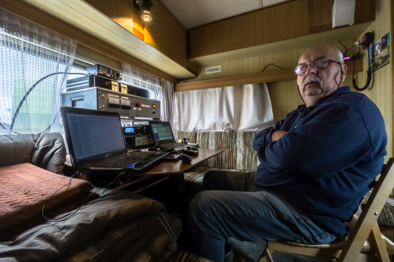 DL5ZA betrieb seine 23cm Anlage im Wohnwagen und bekam regelmäßig Besuch. Auf diesem Bild sinnierte er über den Betrieb,