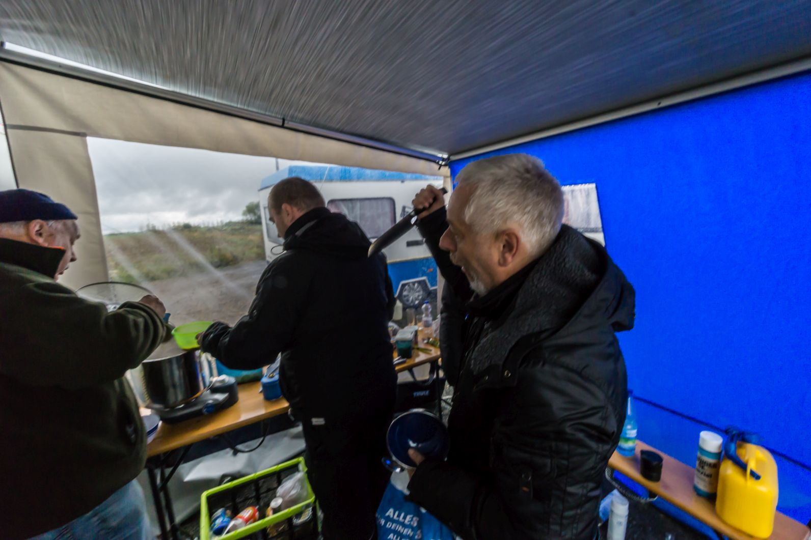 Der Wind pfoff anständig und so wurde die Wagenburg möglichst winddicht errichtet, weitere KFZ spielten Windschott.