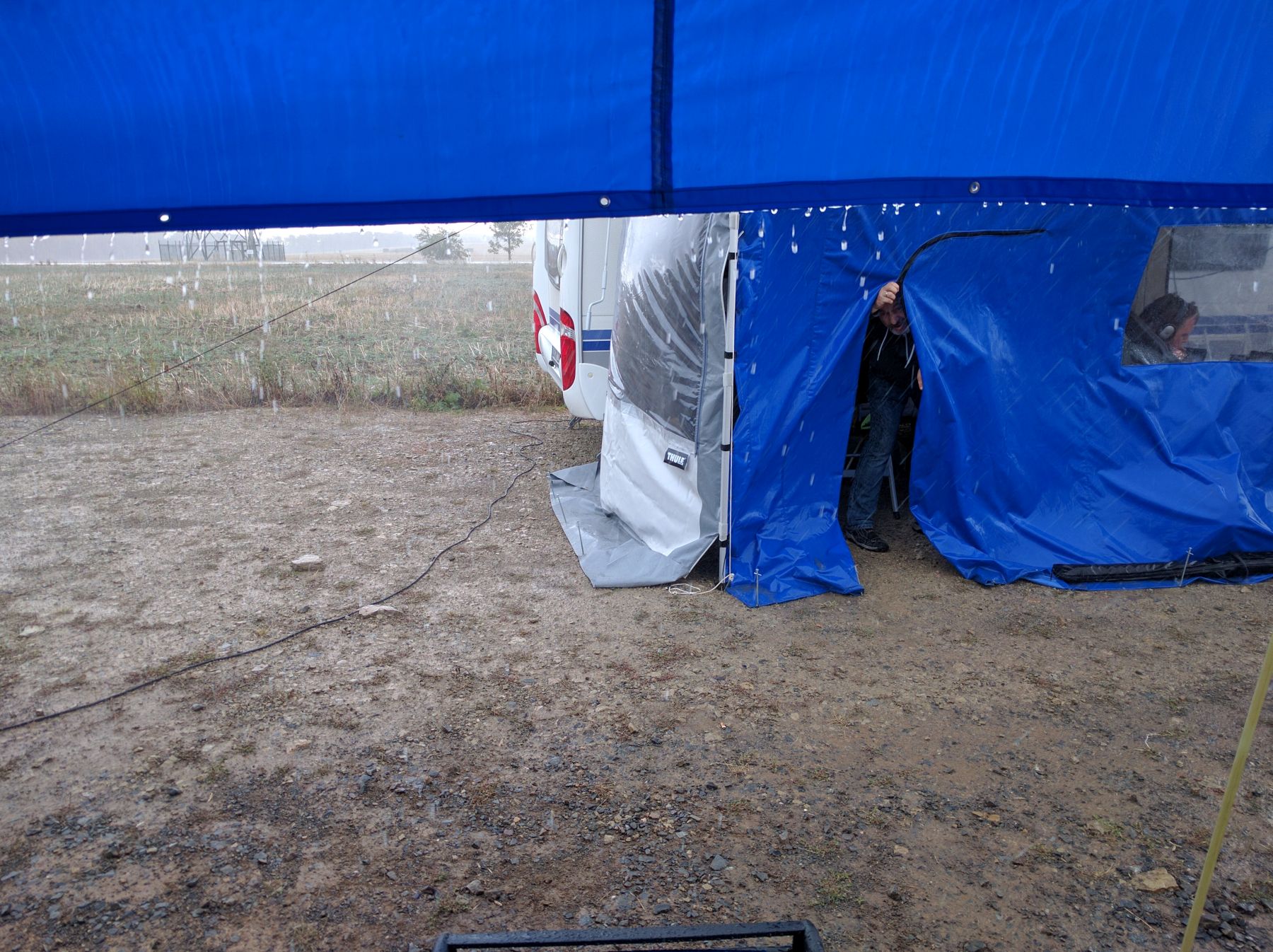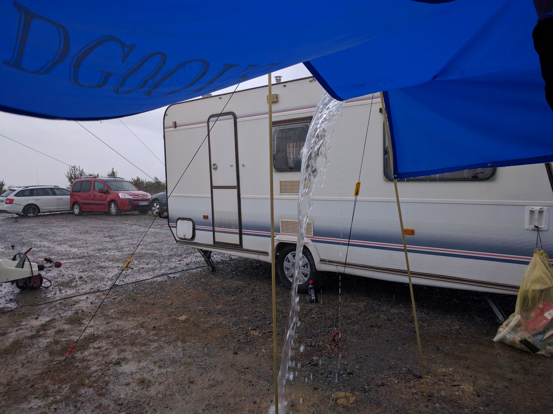 DL5ZK ist etwas wasserscheu, floh unters Zelt und verschloss die Wetterseite des Zeltes gerade noch rechtzeitig