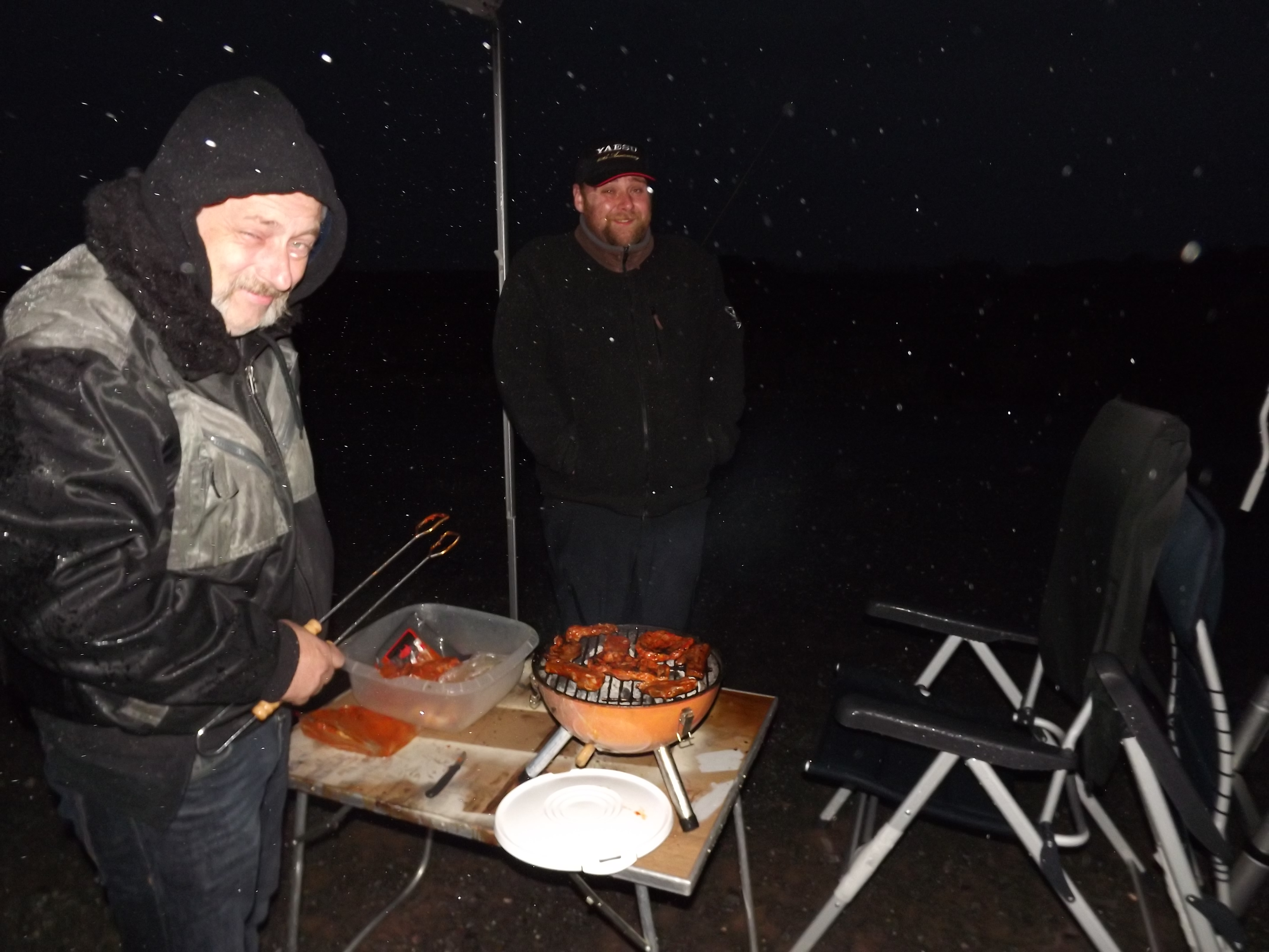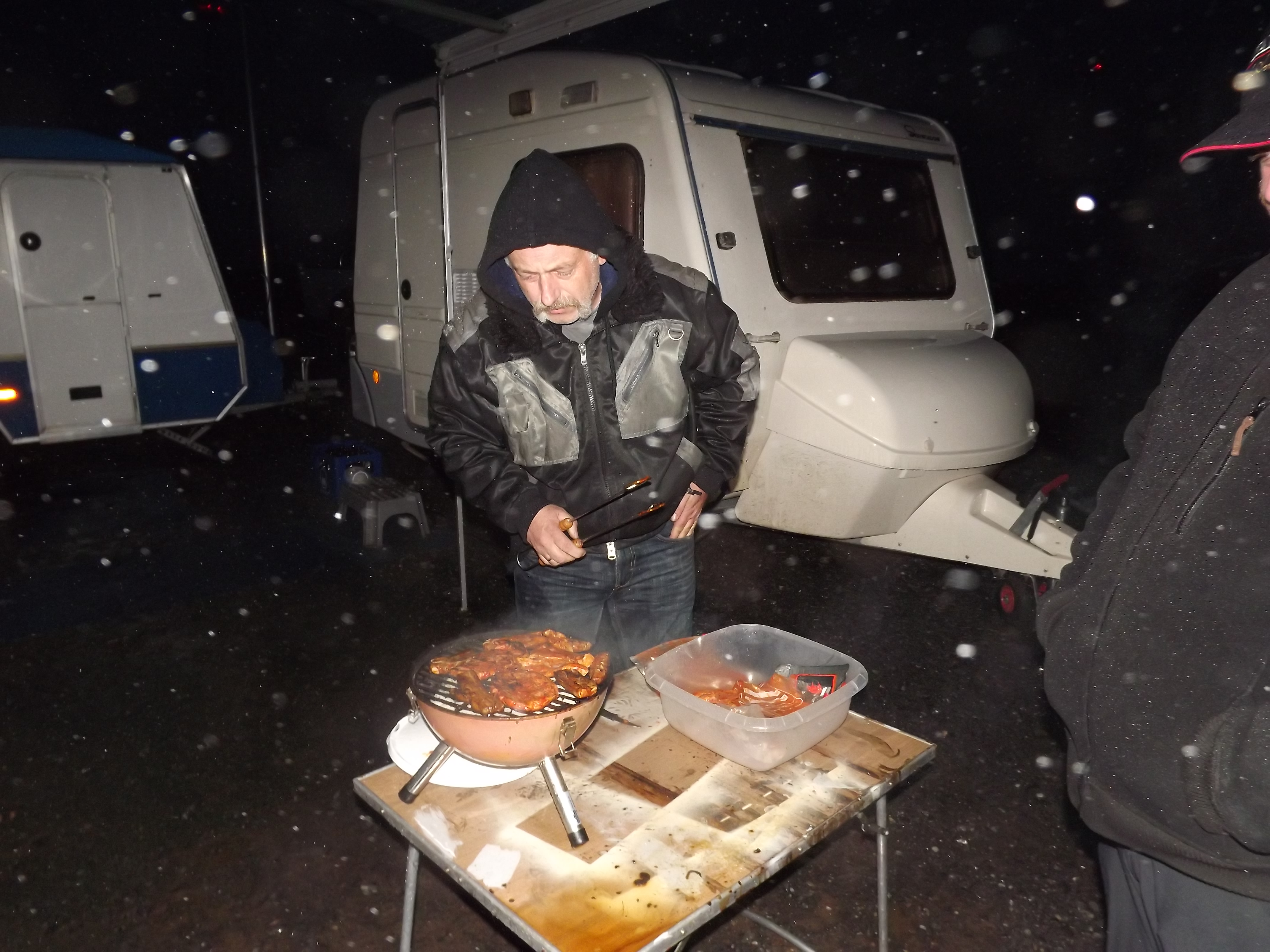 Die weißen Flocken sind kein nuklearer Fallout sondern Regen. Die bewährte Wagenburg hielt wieder das schlimmste Wetter ab.